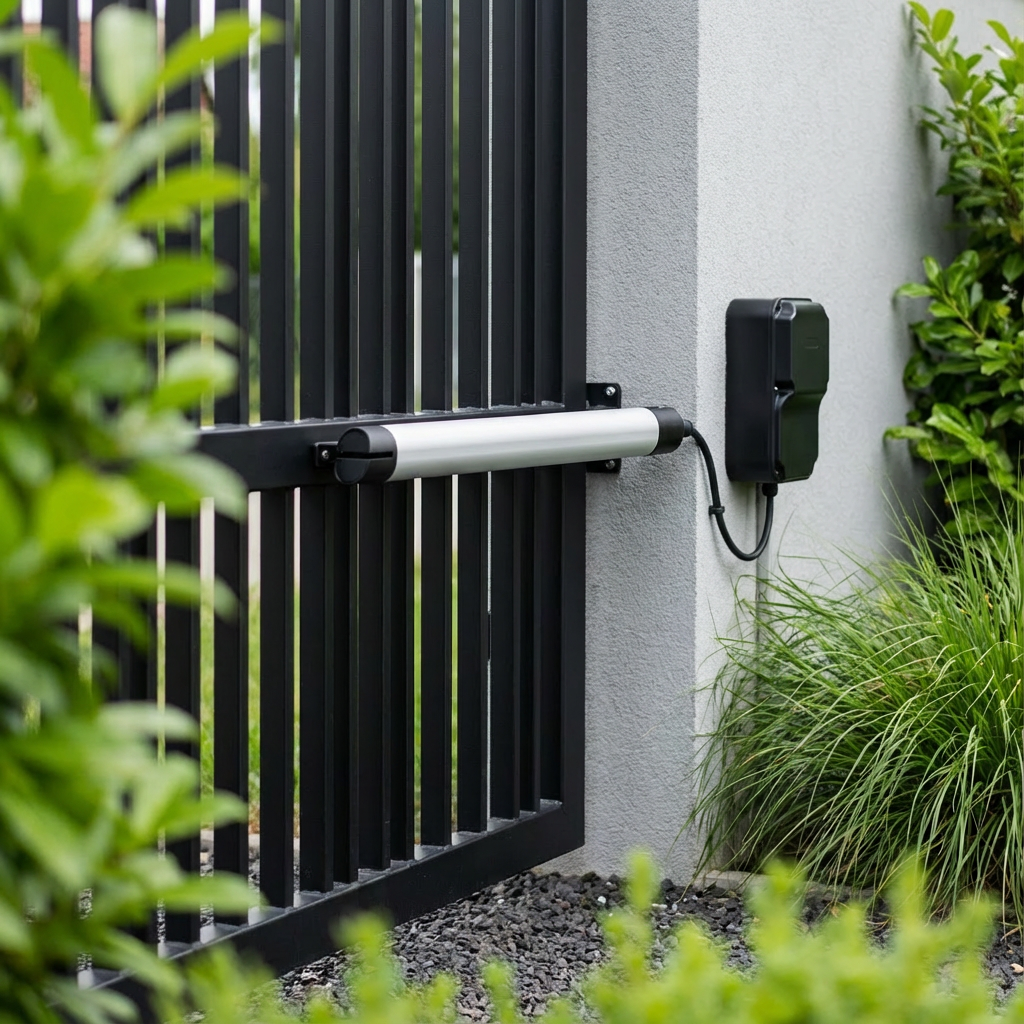 Uniwersalny siłownik do bramy dzięki prostej konstrukcji śrubowej. Solidna konstrukcja siłownika do bramy oraz ponadczasowy design pasuje do każdej bramy skrzydłowej i jej otoczenia.